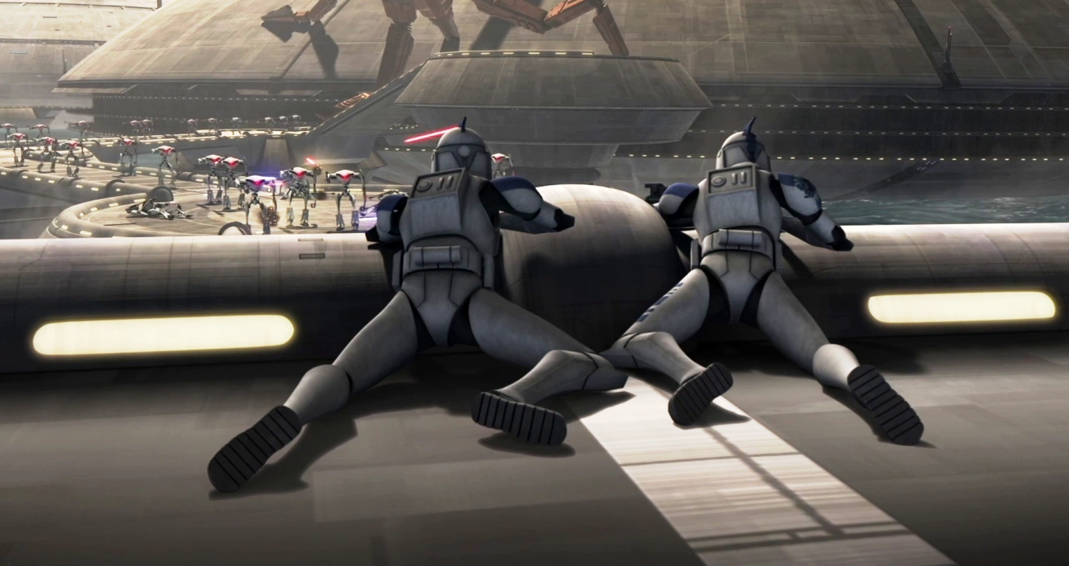 Ventress and her forces were soon able to break through the monastery door's controls, and the defense of the monastery cost Rex all but five troopers. The Captain and the rest of the survivors launched a last stand against the battle droids. General Kenobi and the 212th Attack Battalion eventually arrived at Teth, reinforcing the remnants of the 501st and securing the defeat of the Separatists. A treaty was established between the Republic and Jabba the Hutt,[21][17] but although the 501st was replenished with new troops, the loss of the original Torrent Company left scars on all involved. Soon after, Rex and troops of the 501st were redeployed with Skywalker and Tano aboard their recently-christened fleet of Venator-class Star Destroyers to protect Bothawui from the Confederate General Grievous, who was intent on capturing the planet. Departing from Coruscant,[22] Skywalker's forces eventually arrived at Bothawui and defeated Grievous, securing a Republic victory.[23] 501st troopers Rex and Denal[8] also helped Skywalker and Tano in destroying the Separatist listening post Skytop Station.[24]