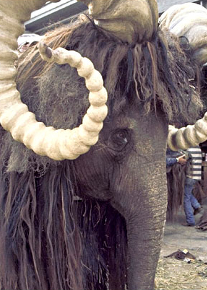For banthas' first canon appearance in A New Hope, They were played by Mardji, a 22-year-old female Asian elephant. It took six crew members to make Mardji a costume that would fit her and that she would tolerate. The costume's base was a howdah, or elephant saddle, with added palm fronds to create the shaggy coat of a bantha. They then added a special head mask that was molded from chicken wire and then sprayed with foam to give it the correct shape. The dangling hairs on the underside of the bantha's mouth was made from horse hair and flexible home ventilation tubing was the base for the curving horns. While the weight of the mask for the costume was cause for concern, it was actually the shaggy tail that was made from wood and covered with thick thistles that took some getting used to for Mardji. Despite her training, Mardji's trunk would occasionally pop out of her costume, but the cast and crew, including George Lucas, liked Mardji too much to get impatient. To get the shot of the two banthas that Luke spots, they used an effect called optical compositing. The moan-like sounds that the banthas make were bear noises slowed down by sound designer Ben Burtt. They were given to him by documentary producer George Casey.[20]