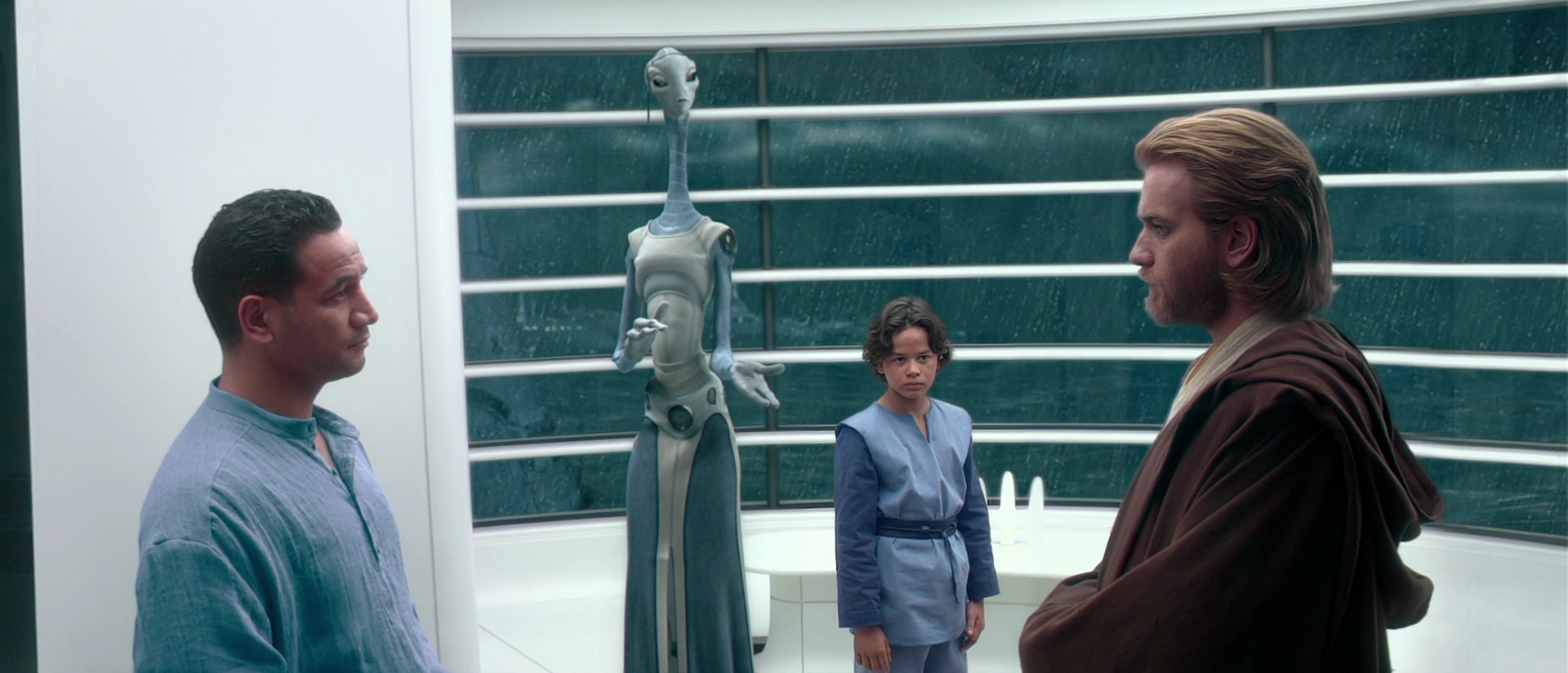 Boba confronts Kenobi, disguised as Rako Hardeen, in prison on Coruscant.