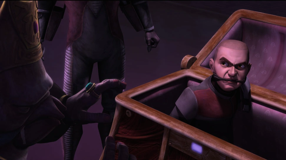 The team embarked on their mission by taking the space elevator down beneath the surface of the planet, where they boarded the tram and made their preparations to defend the chest from the raiders. The raiders boarded the tram during its journey and attacked, killing the Quarzite personnel. Most of the bounty hunters were thrown off of the tram. During the struggle against the raiders, Boba inadvertently knocked the chest over, revealing its contents: a young woman named Pluma Sodi, who had been kidnapped so she could be married to Otua Blank against her will. The leader of the raiders, Krismo Sodi, was her brother, who had been trying to save his sister. Ventress and Boba, who managed to remain on the tram, argued about the situation after Pluma pleaded with the former Sith acolyte, who felt sympathy for the girl; Ventress had also been forcibly taken from her home. Boba, on the other hand, intended to continue with the operation. Ventress used the Force to choke Boba, preventing him from fulfilling the mission.[14]