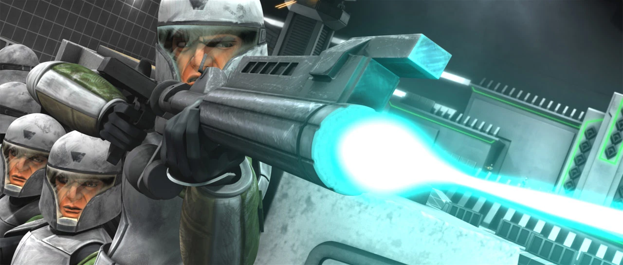 A clone cold assault trooper firing a DC-15A