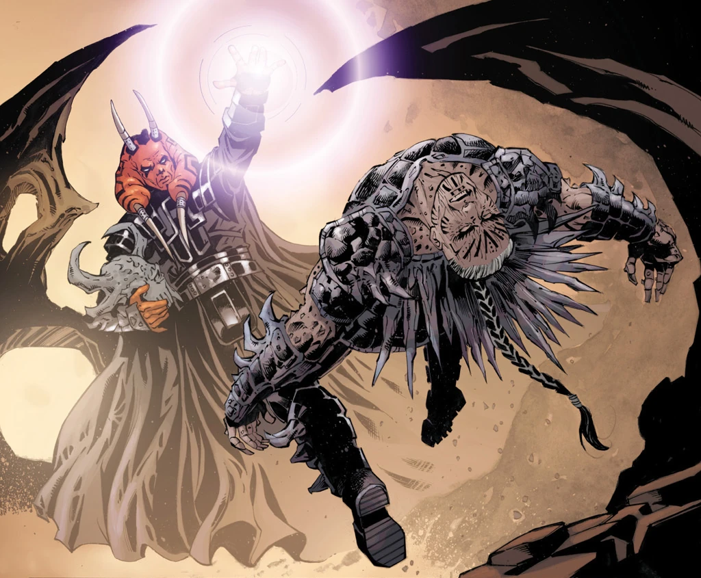 Darth Krayt defeating Darth Wyyrlok in a lightsaber duel.