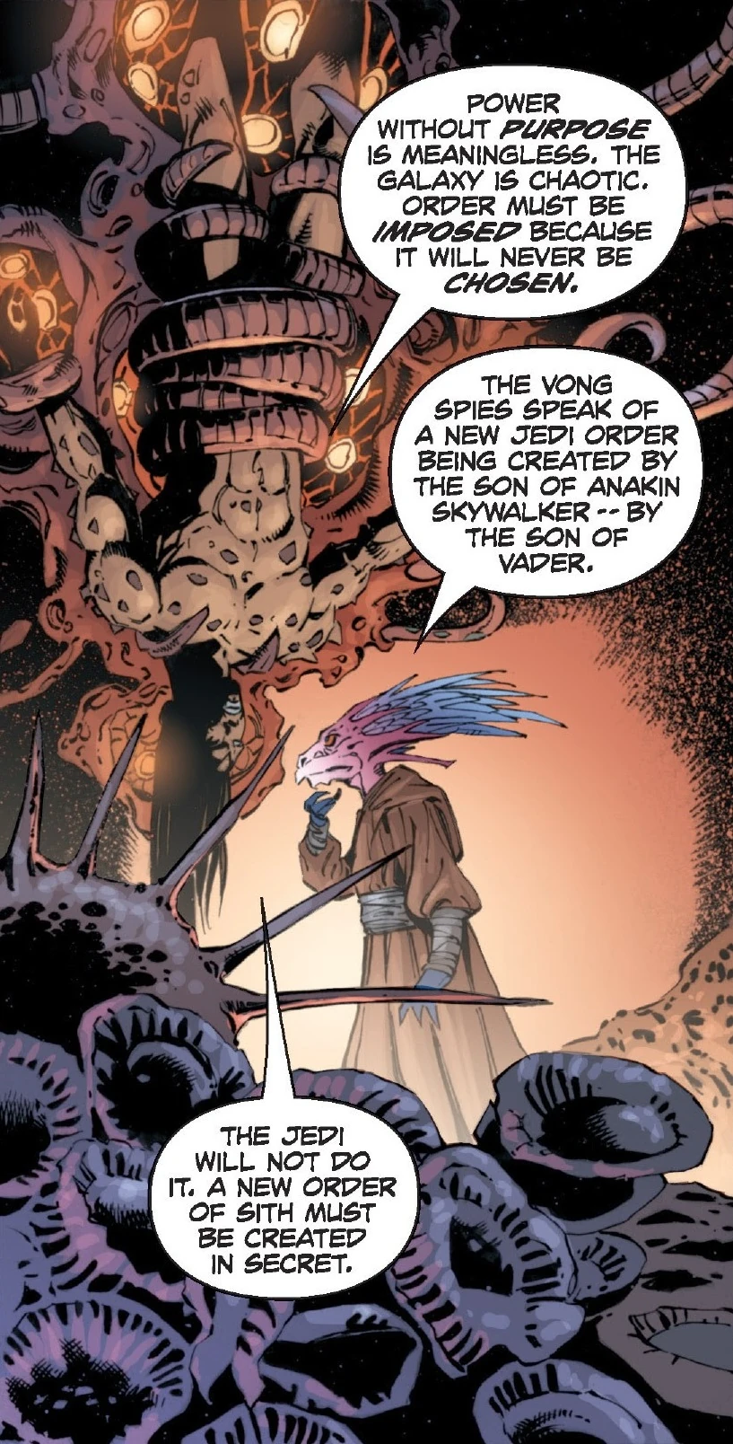 - "Lingering hatred festered on worlds that had suffered heavily at the hands of the Yuuzhan Vong. That hatred gave us our opening. We manufactured a cause for war, making the Vong seem responsible. Split, the Galactic Alliance began to fight itself. And so died."