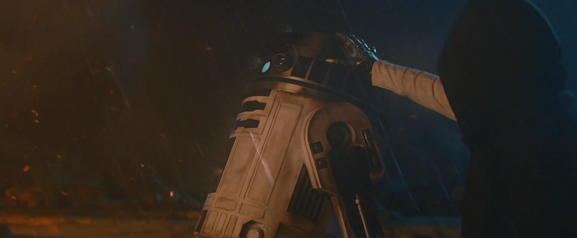 Close to death by his own lightsaber as he struggled against Fett, R2-D2 saved him by hurling Kenobi's box and knocking the hunter out. Still blinded and carrying the box, Skywalker had R2-D2 lead him to his X-Wing.[23] On his way to an unknown location, he read some of Kenobi's passages on his journals, including one set during the Great Drought involving him.[12]