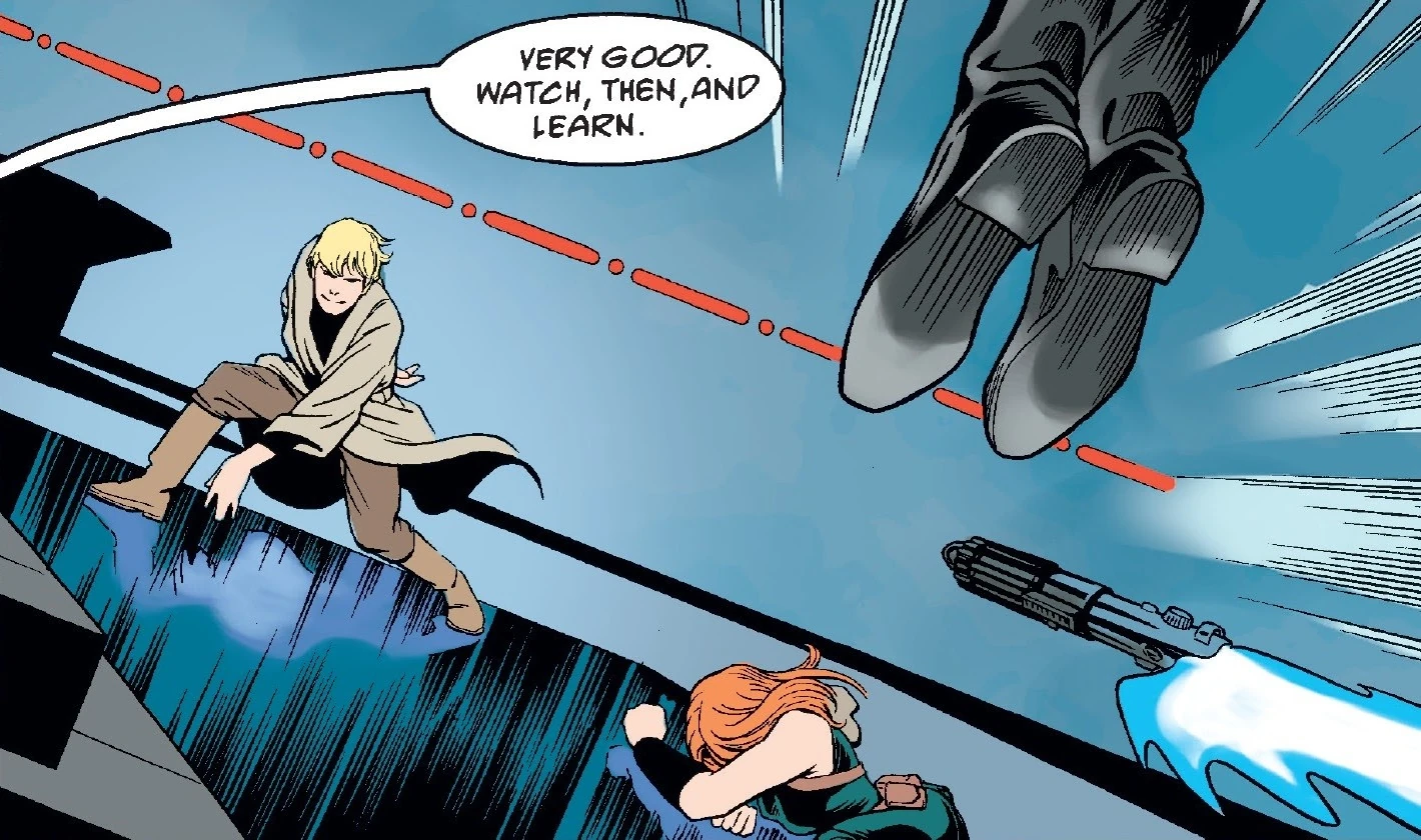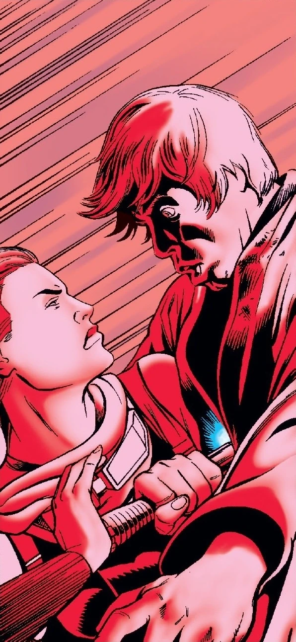 Skywalker's sister, Leia Organa Solo, along with her husband, Han Solo, and the smuggler Talon Karrde, found their way into the throne room during the battle. An attack from C'baoth left Organa Solo incapacitated, prompting Skywalker to aggressively attack his clone in a bid to finish the duel quickly and save his sister. The clone Luuke fell back before the onslaught, barely being able to block Skywalker's blows. The clone then retreated up a set of stairs to his master's side while Skywalker seemingly pursued him. Skywalker, however, switched his lightsaber off and attempted to bargain his own life with C'baoth for those of his comrades. As C'baoth conversed with Skywalker and Jade, the clone reignited his lightsaber and leaped toward Skywalker, who ignited his own weapon just in time to parry the clone's aerial attack. The clone drove Skywalker off the stairway and onto the floor below, and the two continued their fight on the lower level until Skywalker leaped back up to the main floor with the clone in pursuit. The clone then attacked Skywalker with vicious horizontal thrusts, slowly backing the Jedi against a wall. Jade managed to recover Organa Solo's lightsaber while C'baoth was distracted and charged at Skywalker's clone. The clone was aware of Jade's imminent attack but decided to take a gamble and finish off Skywalker first. As the clone swung his lightsaber for a finishing blow, Skywalker ducked, causing the clone's lightsaber to slice through a viewscreen mounted on the rock wall behind Skywalker. The electronic components of the viewscreen exploded in the clone's face, and he shrieked, staggering backward. Dazed and angry, the clone raised his lightsaber in attack toward Jade. The former Emperor's Hand ducked and struck the clone with a killing strike, thus fulfilling the last command given to her by Palpatine: to kill Luke Skywalker.[1]