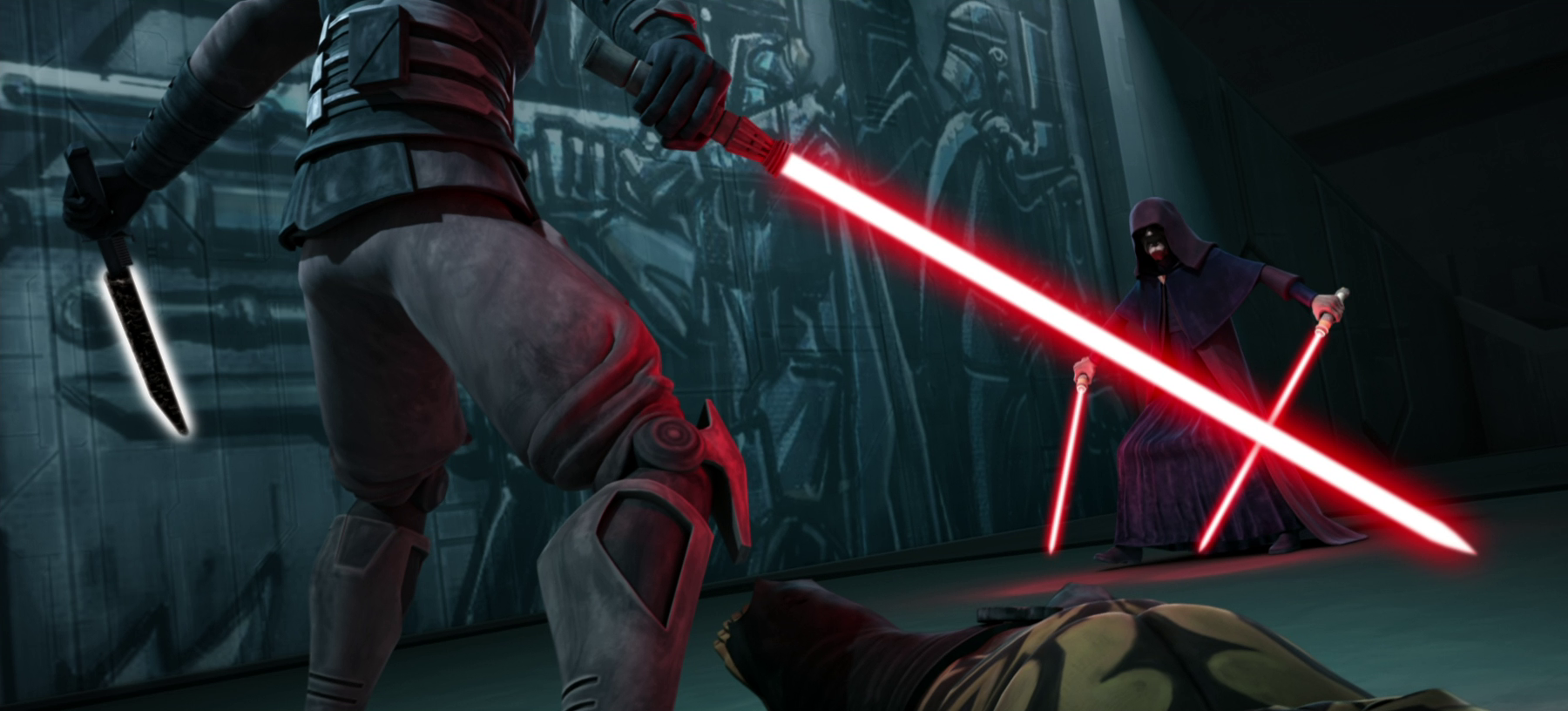 Darth Maul dual-wields the Darksaber and his lightsaber against Darth Sidious.