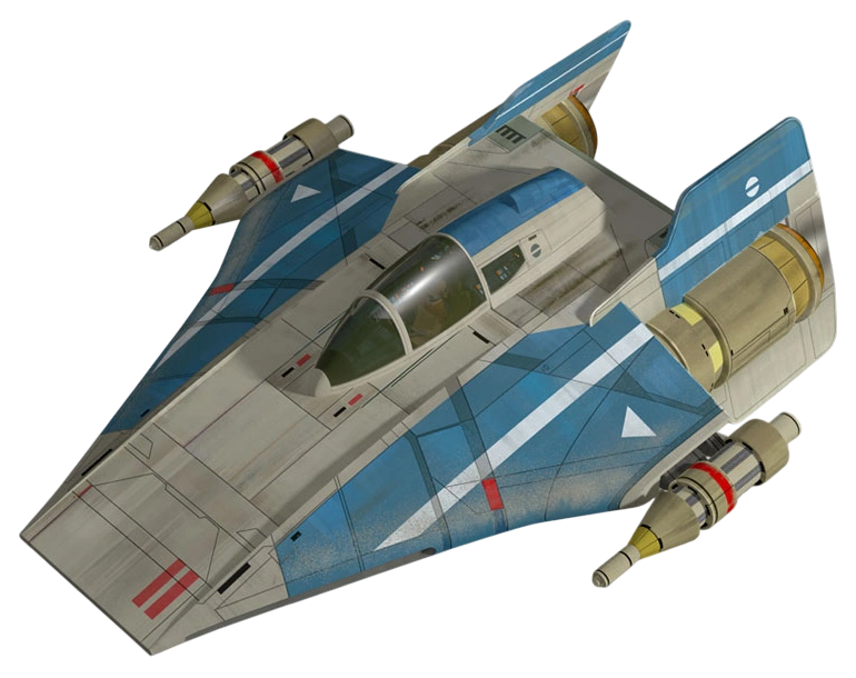 The RZ-1 A-wing starfighter[1] was a quick, powerful strike fighter[2] manufactured by Kuat Systems Engineering.[1] Influenced by the designs of the Republic starfighters flown during the Clone Wars, the A-wing was wedge-shaped with dual sublight engines mounted on the stern[2] and came equipped with a hyperdrive. The fighters were armed with two laser cannons[4] and twelve concussion missiles.[1] A-wings measured 9.6 meters long.[2]