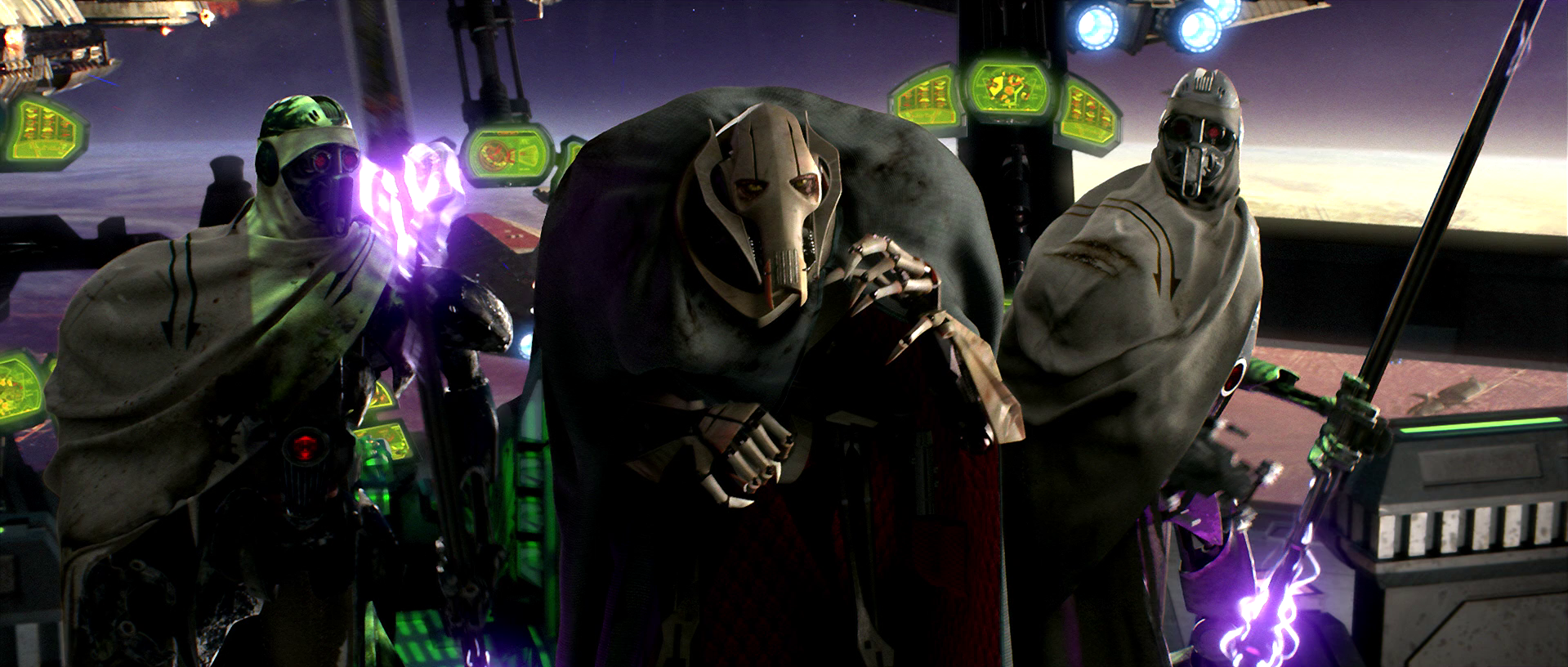 After Grievous has the bridge crew regain control of his flagship by firing the emergency booster engines, he makes certain the two Jedi and their ward are captured. Having fallen foul of a ray shield trap, the three are brought to the bridge under custody, but R2 successfully creates a distraction, allowing the Jedi to retrieve their lightsabers and break free.
