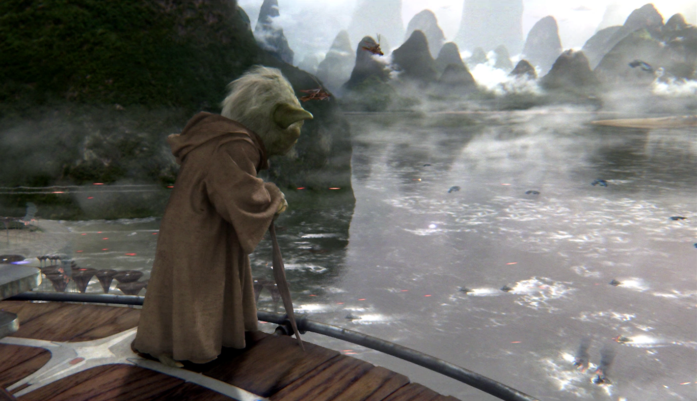 Yoda lands on the planet Dagobah, his home for the rest of his life.